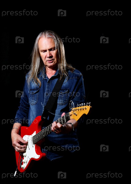 Пожилой мужчина с длинными седыми волосами в синей джинсовой рубашке играет на электрогитаре на черном фоне