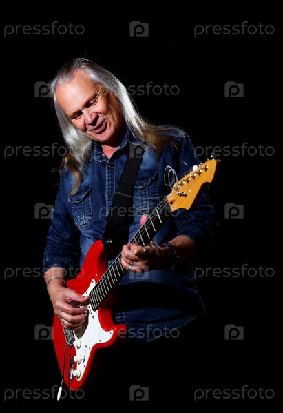 Пожилой мужчина с длинными седыми волосами в синей джинсовой рубашке играет на электрогитаре на черном фоне