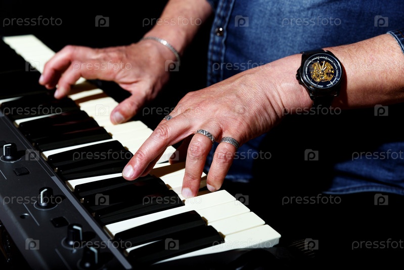 Пожилой мужчина в синей джинсовой рубашке играет на клавишах на сцене на черном фоне. руки крупным планом