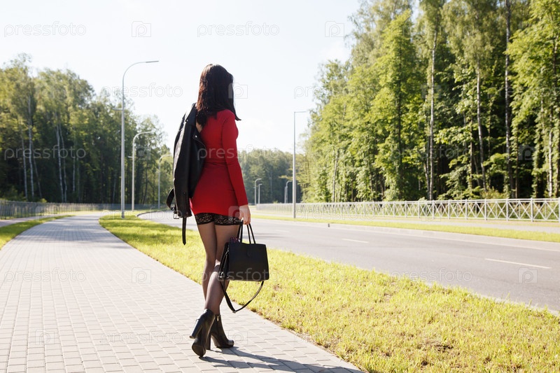 Молодая брюнетка в красном платье гуляет по аллее в парке в солнечный летний день. вид сзади