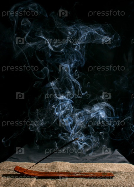 Индийская ароматическая палочка с дымом на черном фоне в помещении крупным планом