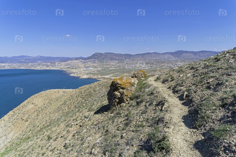 Тропа, идущая по горному склону. Мыс Меганом, вид в сторону урочища Капсель. Крым. Солнечный день в конце апреля