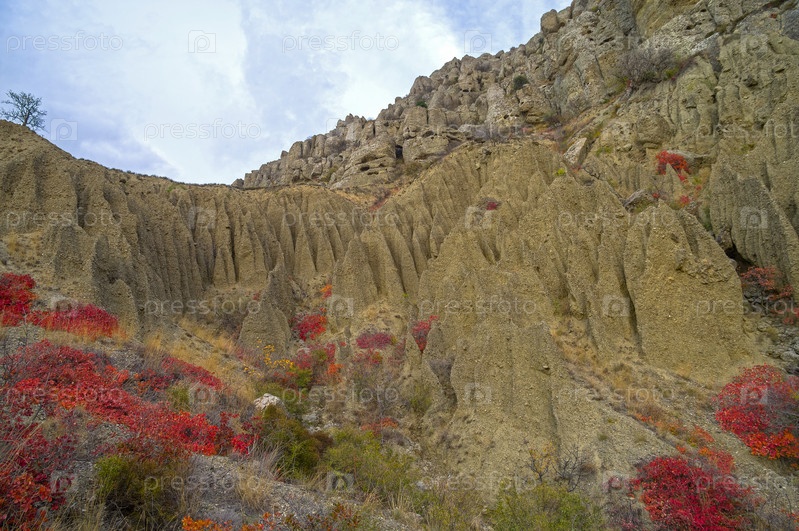 Причудливые глиняные фигуры, образовавшиеся в результате эрозии почвы и выветривания на склоне мыса Меганом. Крым, облачный, день в октябре