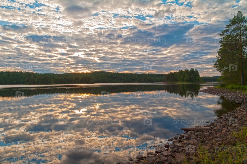 Красивое отражение вечернего неба в реке. Река Чирко-Кемь, Карелия, Россия. Август