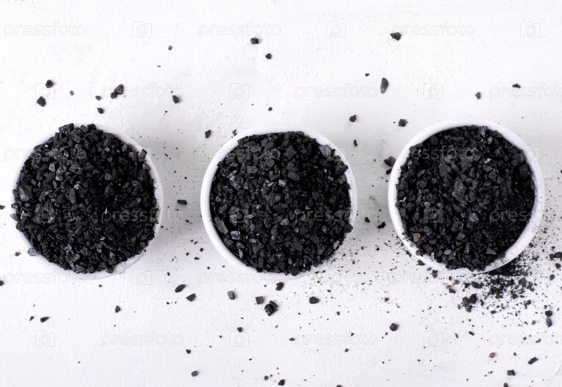 Черная лавовая соль в маленьких мисках на белом столе. Вид сверху
