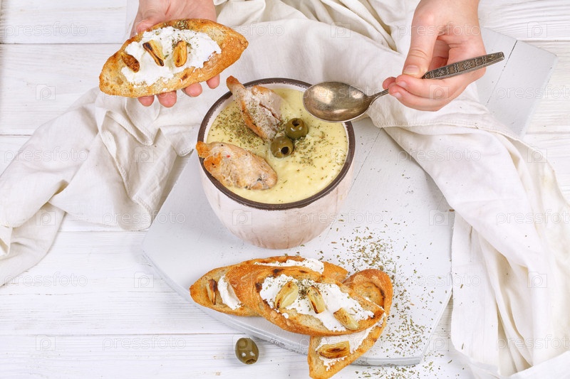 Французский суп-пюре с пастернаком, багет из мягкого сыра