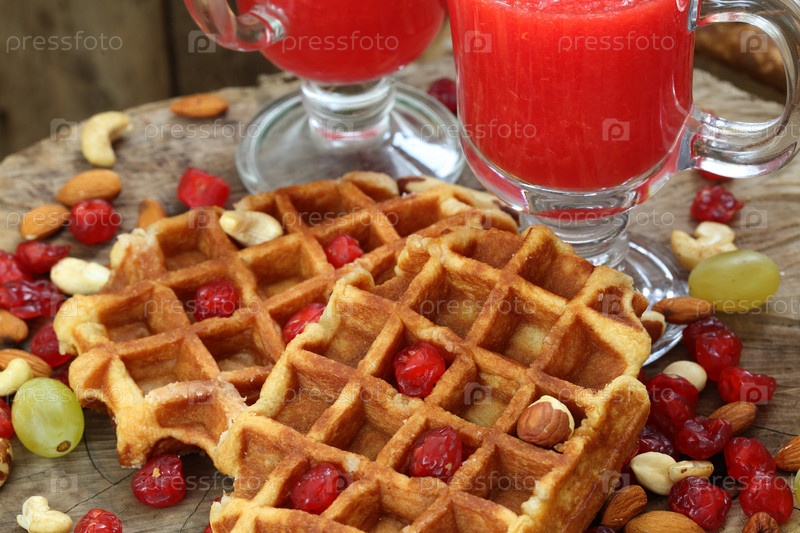 Бельгийские вафли с вишневым соком на деревянном фоне