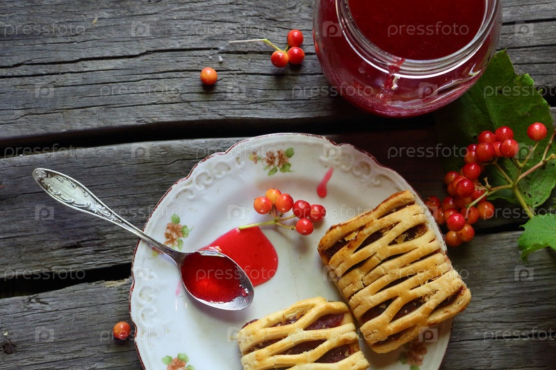 Печенье с калиновым вареньем на деревянном фоне