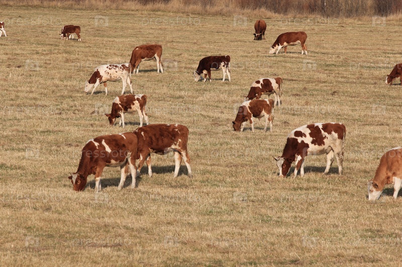 Коровы пасутся на осеннем пастбище