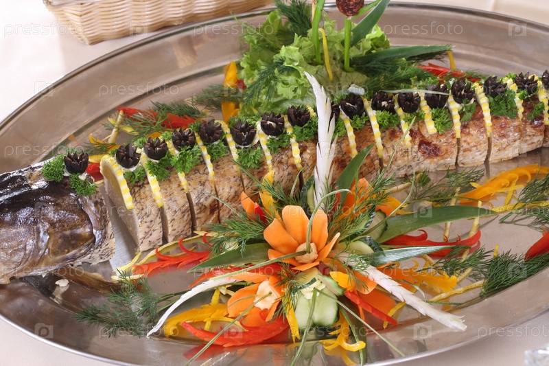 Стол с фаршированной щукой, водкой, самогоном в ресторане