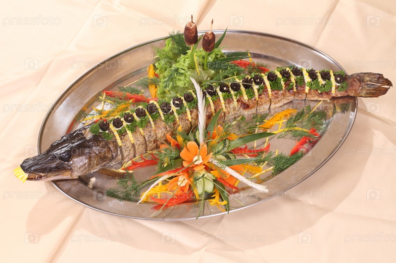 Стол с фаршированной щукой, водкой, самогоном в ресторане