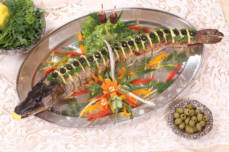 Стол с фаршированной щукой, водкой, самогоном в ресторане