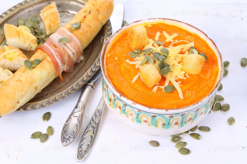 Суп пюре из тыквы с сухариками и сыром на белом фоне