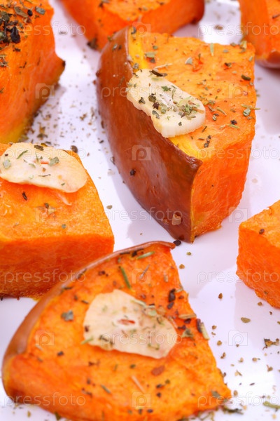 Запеченная тыква с оливковыми травами на белом деревянном фоне