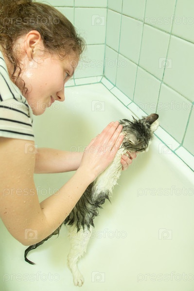 Женщина стирает кошку