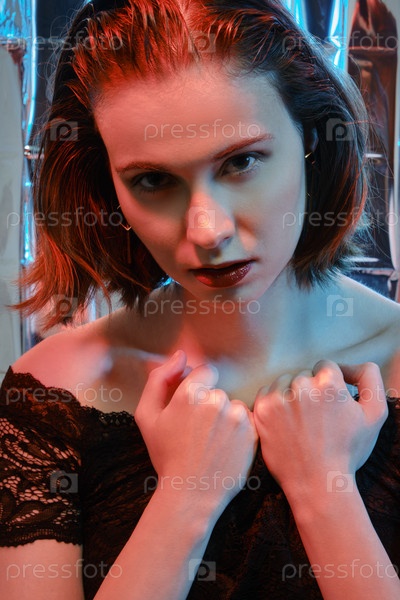 Молодая красивая брюнетка в черном вечернем платье на фоне блестящей серебряной стены с разноцветным светом