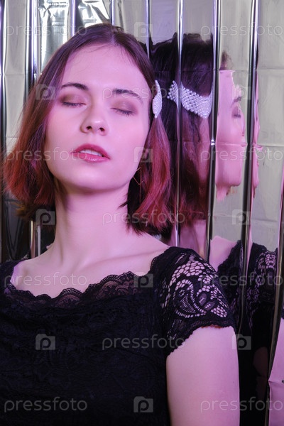 Молодая красивая брюнетка с закрытыми глазами в черном вечернем платье на фоне блестящей серебряной стены с разноцветным светом