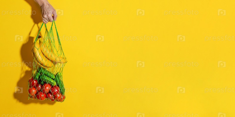 Мужская рука держит белую сетчатую сумку с овощами на желтом фоне