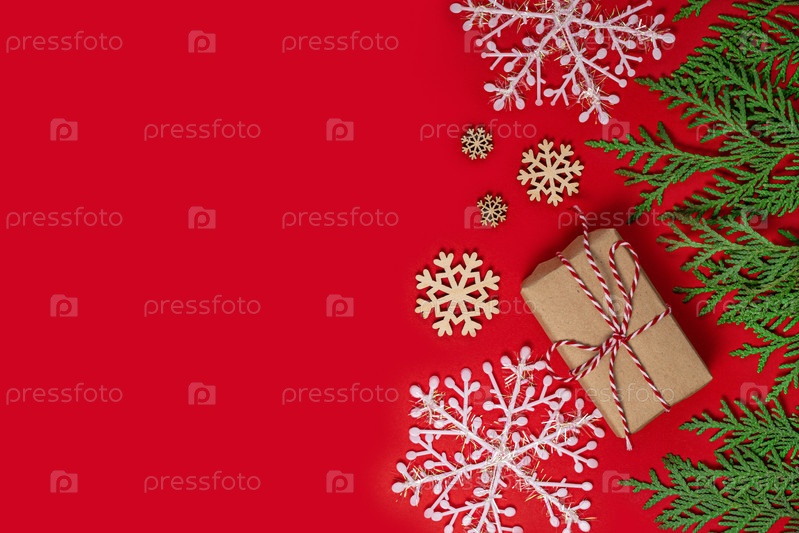Поздравительная открытка с Новым годом и Рождеством. Новогодний фон с подарками и зелеными еловыми ветками