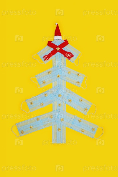 Рождественская елка из медицинских масок на фоне желтой бумаги. Концепция коронавируса
