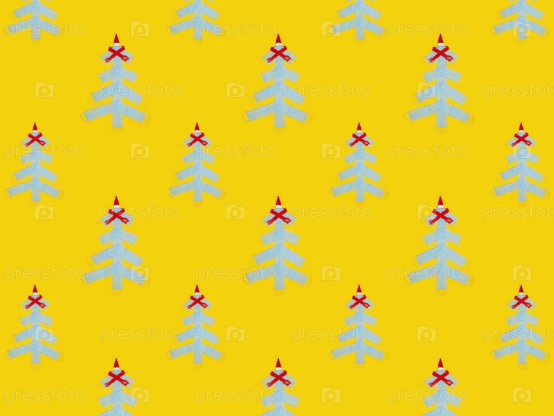 Рождественский бесшовный узор с медицинскими масками на желтом фоне. Альтернативная новогодняя елка из медицинских одноразовых масок, образующая рождественскую елку. Плоская укладка. Концепция коронавируса