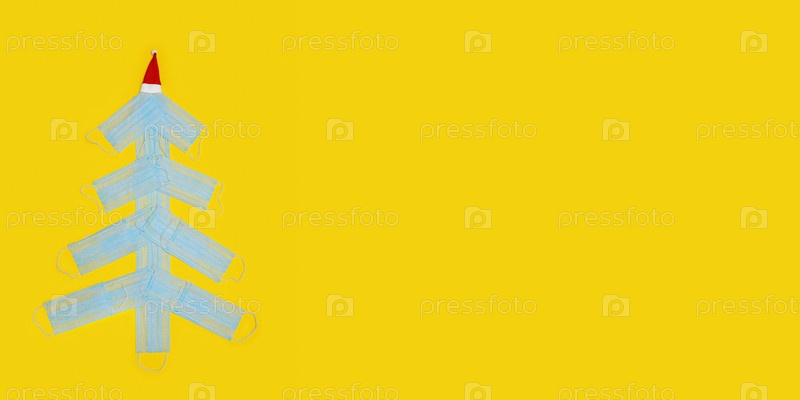 Рождественская елка из медицинских масок на фоне желтой бумаги. Концепция коронавируса. баннер