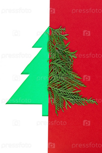 Рождественская елка, вырезанная из бумаги на белом и красном фоне