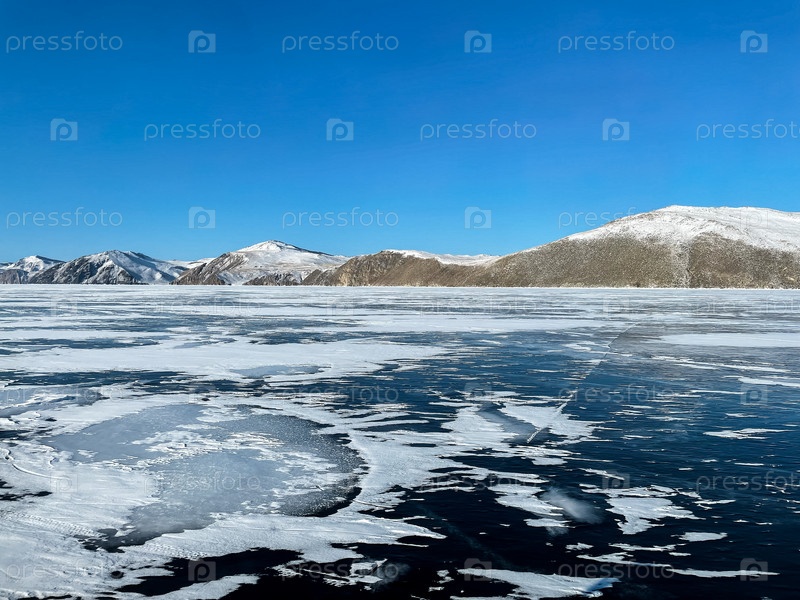 Текстура красивого голубого льда с трещинами и пузырьками воздуха в замерзшем озере