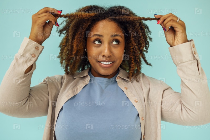 Позитивная афроамериканская модель трогает чистые вьющиеся волосы после гигиенической обработки