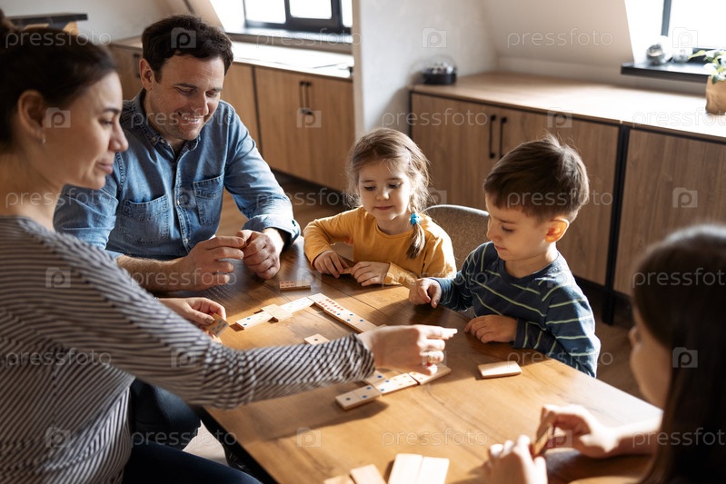 Мать, отец и дети играют в домино, сидя в гостиной у окна