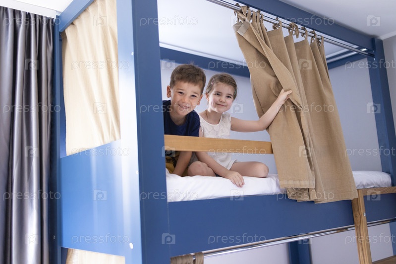 Кавказский маленький брат сидит на двухъярусной кровати и смотрит в камеру с широкой улыбкой