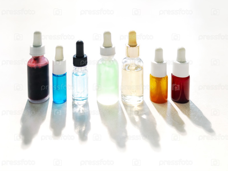 Сыворотка с коллагеном и пептидами в красочных стеклянных бутылках на светлом фоне