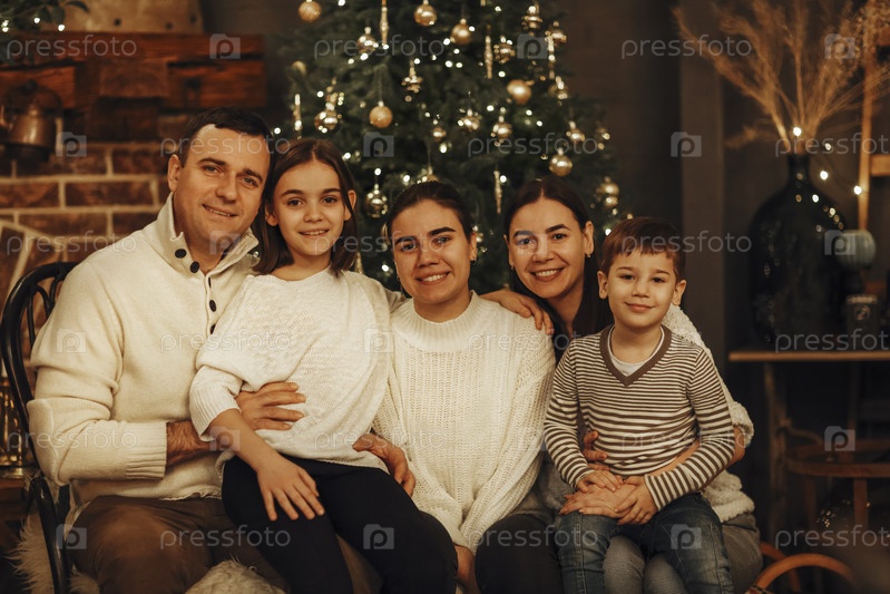 Мать, отец и дети украшают елку в комнате. Любящая семья в помещении