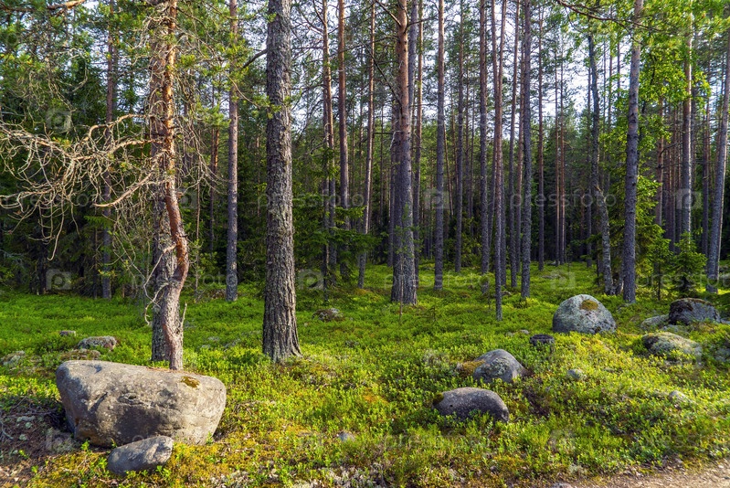 Камни валуны среди сосен в лесу