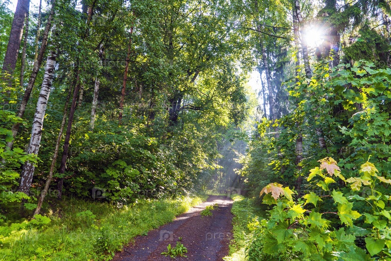 Солнечные лучи в утреннем тумане на лесной дороге. Всеволожск. Ленинградская область