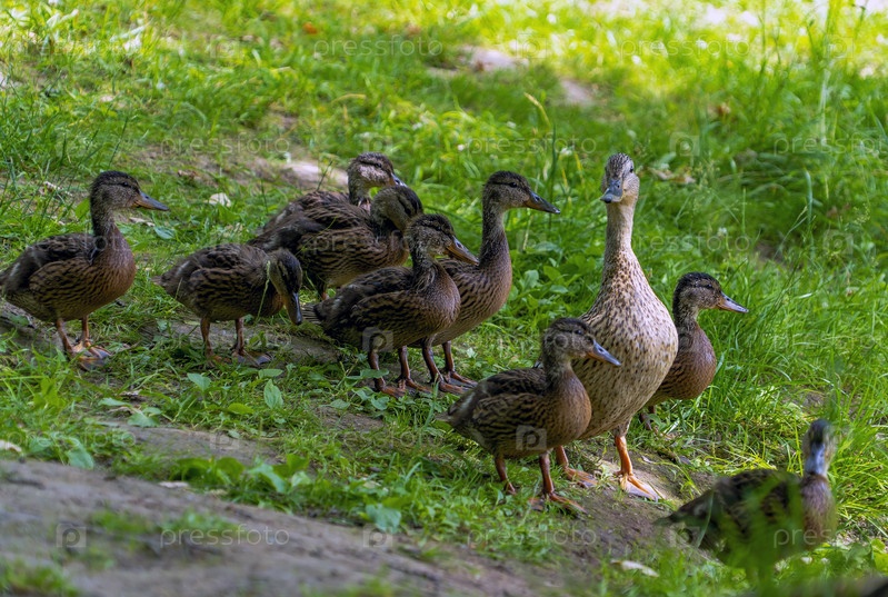 Дикая утка с молодыми утятами идет вдоль берега к воде