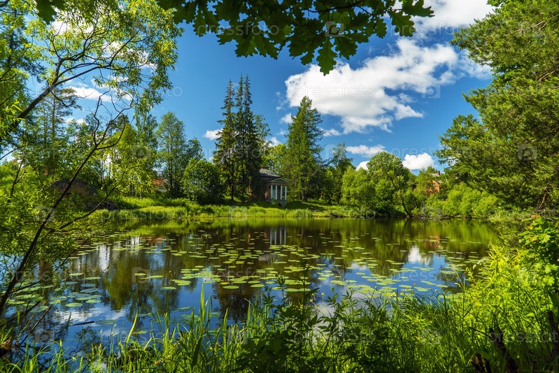 Живописный летний пейзаж на берегу в усадьбе Приютино. Всеволожск. Ленинградская область