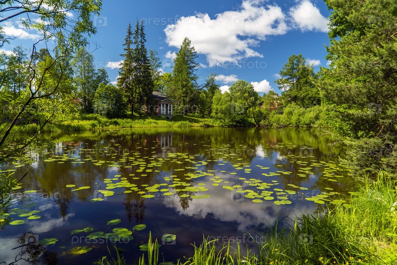 Живописный летний пейзаж на берегу в усадьбе Приютино. Всеволожск. Ленинградская область