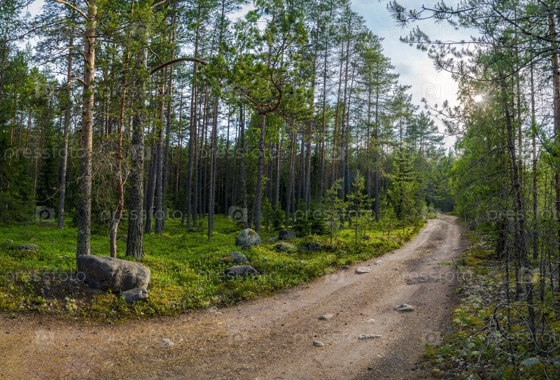 Дорога среди сосен в лесу. Ладожское озеро. Карелия