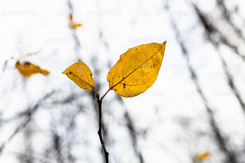 Пара желтых листьев на ветке крупным планом в лесу