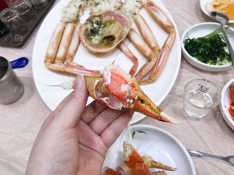 Едят крабов в местном кафе в Южной Корее