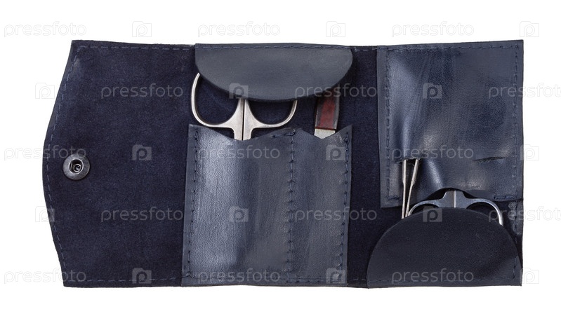 Открытый кожаный чехол с маникюрным набором изолирован
