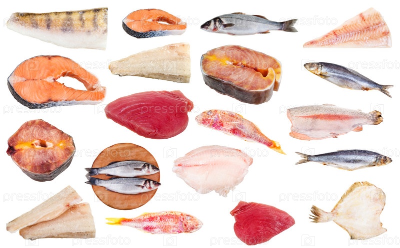 Набор замороженных сырых рыб, изолированных на белом