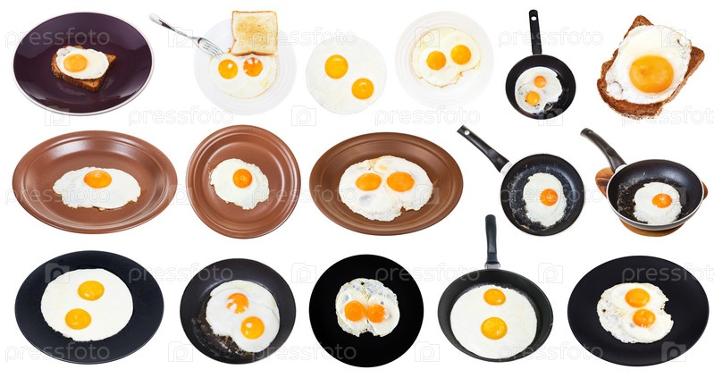 Набор жареных яиц на тарелках и сковородках изолированы