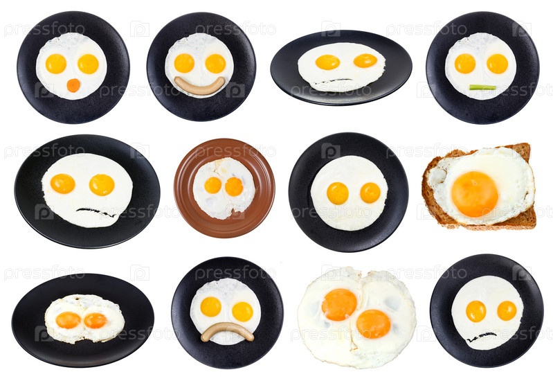 Набор различных жареных яиц на изолированной тарелке