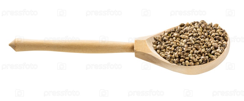 Деревянная ложка с неочищенными семенами конопли изолирована