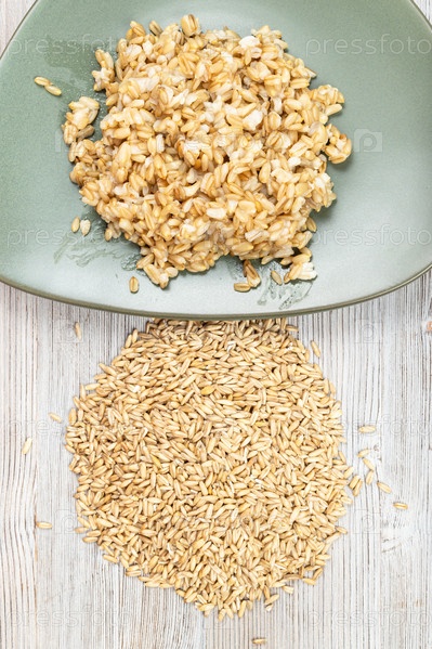 Куча сырых цельных овсяных зерен и вареная каша