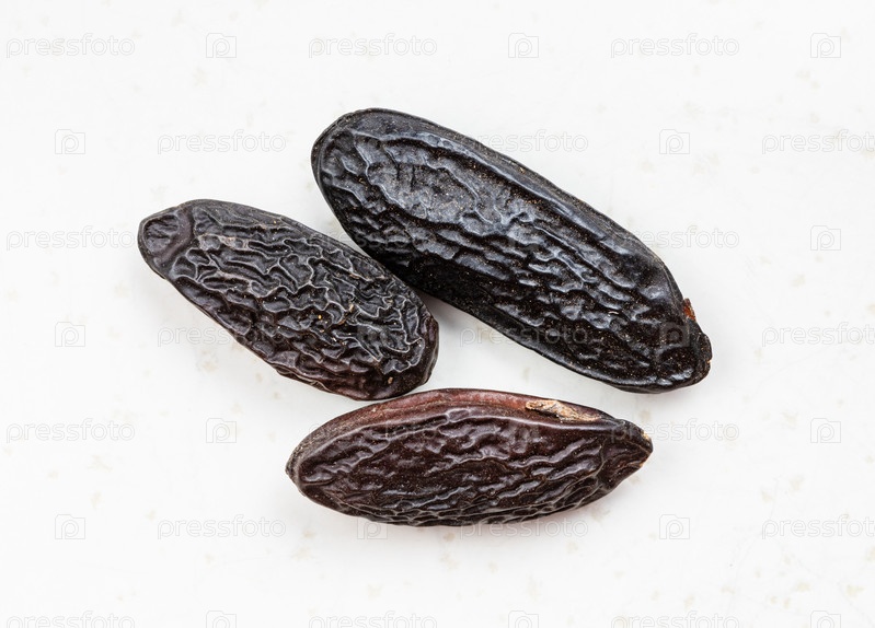 Несколько сушеных бобов тонка крупным планом на сером