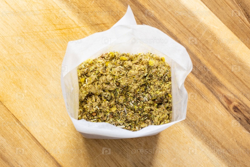 Вид сверху на сухую смесь измельченных лекарственных трав