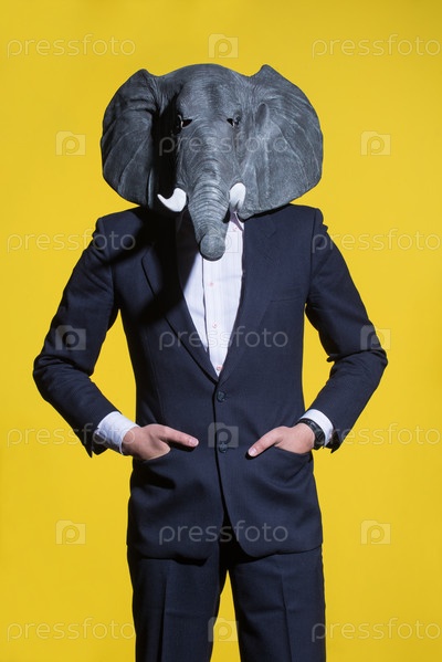 Мужчина в маске слона на желтом фоне